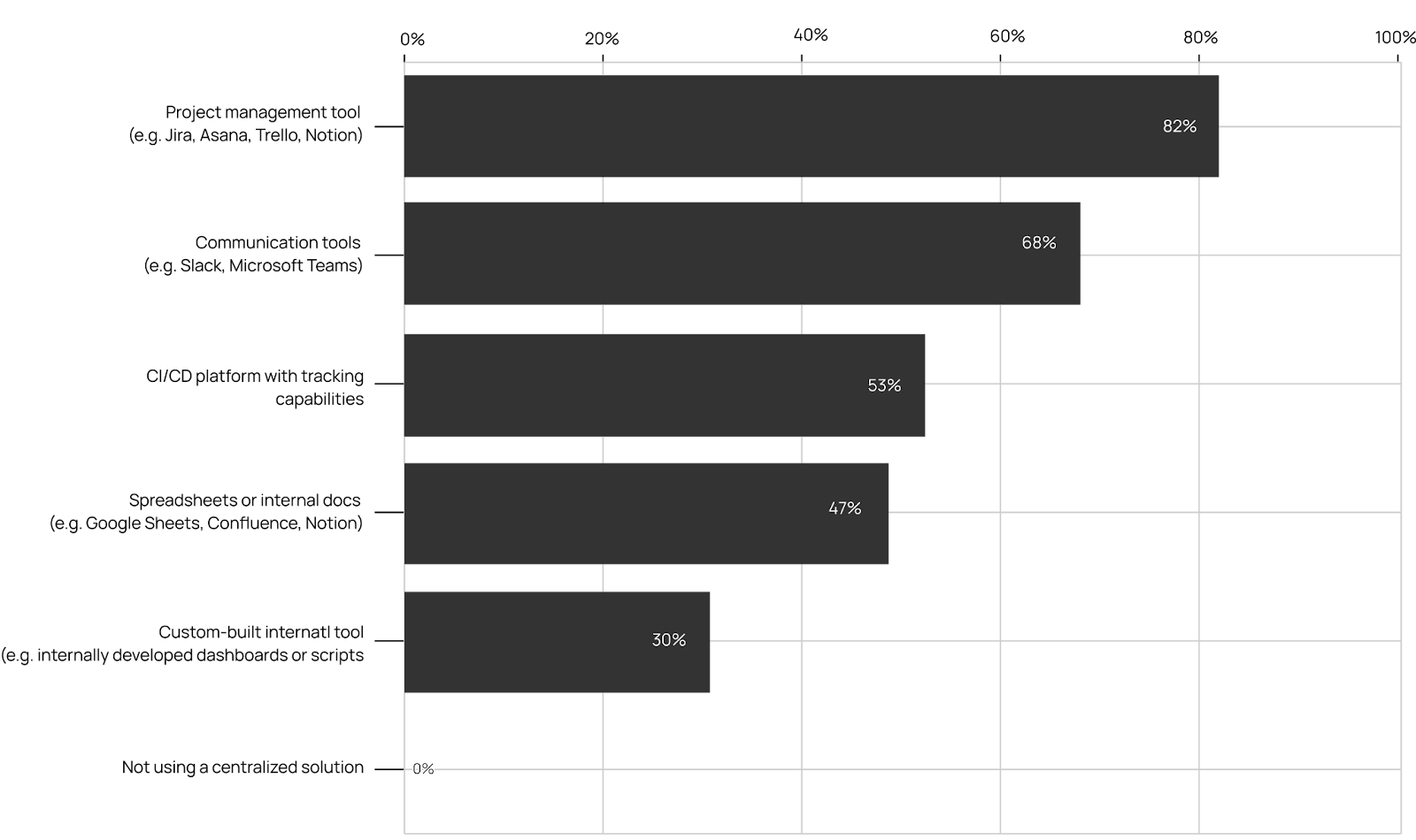 Our data shows that 81% of mobile teams turn to project management tools (spreadsheets/Jira/Asana) and 68% turn to communication platforms (Slack) to coordinate their releases. But this tooling doesn’t lessen the context-switching burden, it compounds it.Â