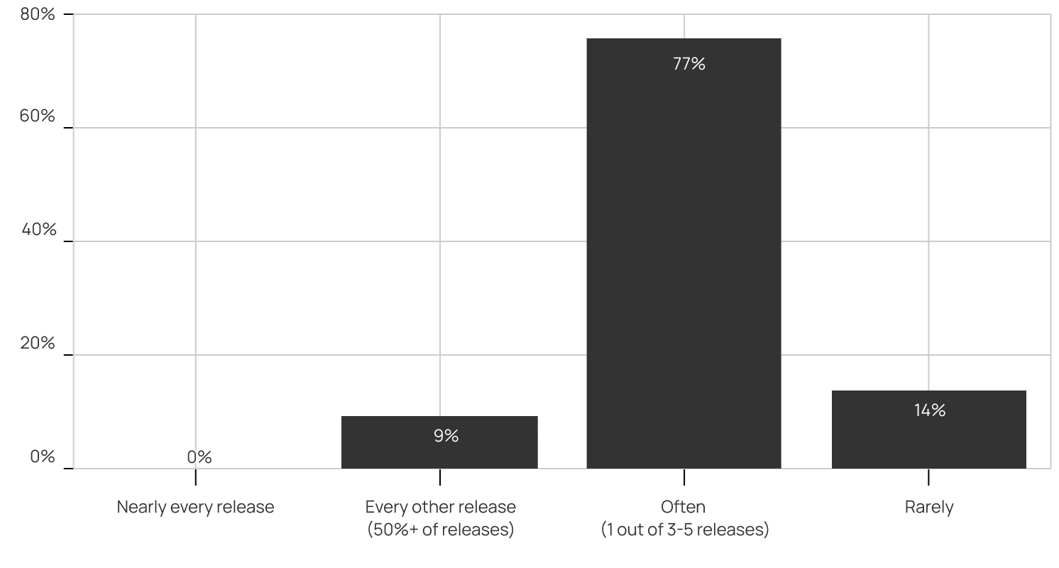 An understandable urge is to automate as much of the release process (and its reporting) as possible. Unfortunately, this often doesn’t actually ease the pain. Seventy-five percent of teams regularly invest in automation and scripting for their release processes to fix these issues. However, these teams still report ongoing challenges with wasted time, high incident rates, and unpredictability.Â