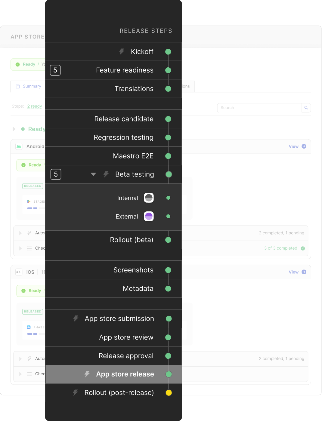 For cross-platform teams, Flightpaths lets you realize the full efficiency of building cross-platform in the first place. Define a unified release blueprint that spans both platforms, manage the entire release lifecycle in one place, and ship new versions without needing to set foot in App Store Connect or Play Console.