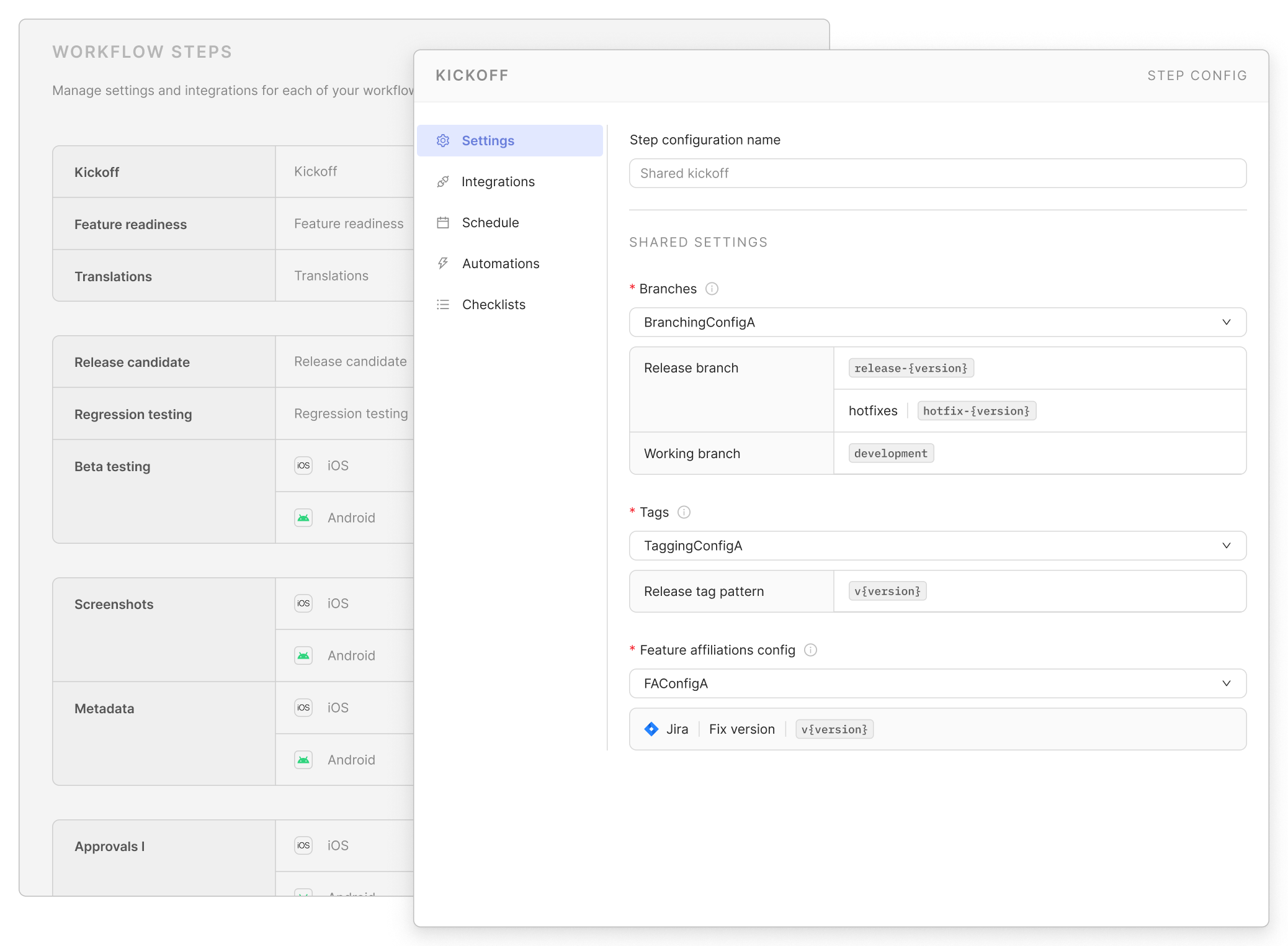 One of the most powerful aspects of Flightpaths is the ability to configure a centralized definition of your release process and apply that across any number of apps, while still leaving room for one-offs and app-specific behavior where necessary. By enabling shared settings for everything from release schedules, to step automations, to rollout safeguards, you can codify a standard release process across apps to increase efficiency, reduce tech debt and process drift, and generally make stakeholders’ lives easier in the process. Where certain teams or products need to ship differently, you can configure that—you get shared structure where it makes sense, and app- or platform-specific flexibility where you need it.
